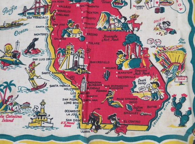 THIS IS A BEAUTIFUL OLD VINTAGE CALIFORNIA SOUVENIR MAP TABLECLOTH WITH THE ORIGINAL TAG AND PRICE OF $2.75