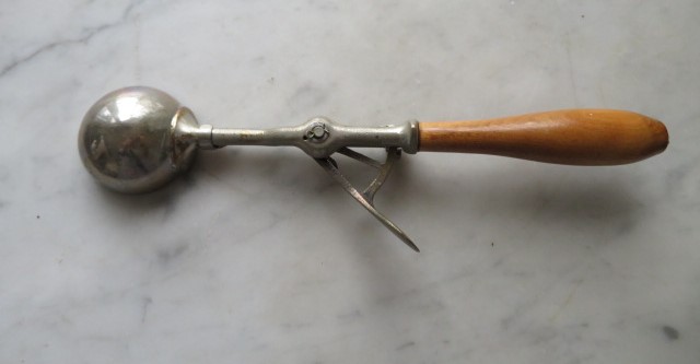 THIS IS A WONDERFUL OLD 1930'S ICE CREAM SCOOP OR SCOOPER THAT IS METAL WITH A WOOD HANDER AND A HARD TO FIND SMALLER SCOOP BOWL.
