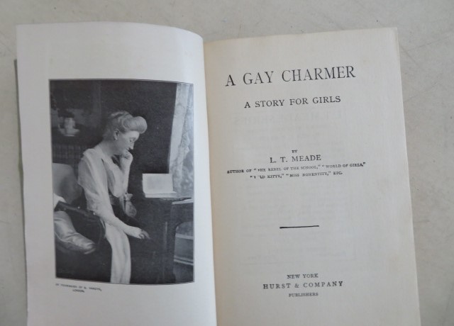 THIS IS A VINTAGE HARDCOVER BOOK TITLED "A GAY CHARMER BY AUTHOR L. T. MEADE WITH A COLOR PASTE ON ILLUSTRATION OF A WOMAN IN A WHITE DRESS SITTING BY A WISTERIA VINE.