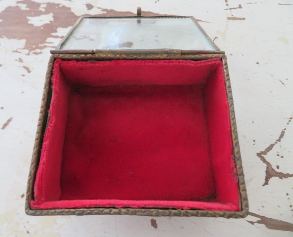 THIS IS A BEAUTIFUL OLD VINTAGE FOOTED CASKET, TRINKET OR JEWELRY BOX WITH GLASS ON THE LID AND EMBOSSED GARLANDS ALL AROUND.