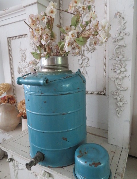 THIS IS AN AMAZING OLD VINTAGE LARGE STANLEY "WILL NOT BREAK" THERMAL WATER DISPENSER COOLER THERMOS WITH SPIGOT IN AQUA BLUE.