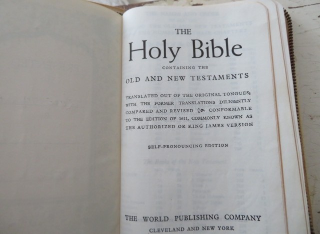 The Bible itself doesn't have a date, but there is a handwritten date of 1961, The cover has stained and yellowed with some whiter areas in the corners. There is a metal cross at the zipper pull. There are colored pictures inside. There is yellowing, minor stains, some unstitching at the zipper, at the bottom, and wear.