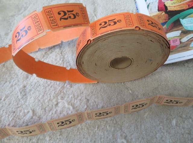 Did you see the article in this months Country Living Magazine about the wheels or rolls of vintage tickets like these? These are an orange in color, with the ones at the end faded to a lighter color.