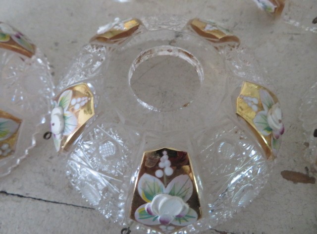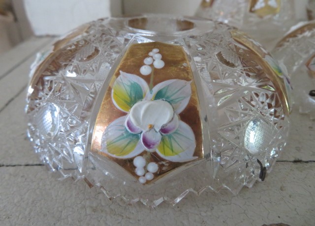 THESE ARE FIVE EXQUISITE OLD ANTIQUE BOBECHES THAT WERE SALVAGED FROM AN OLD CHANDELIER. THEY HAVE THE CUT GLASS WITH GOLD PAINTED DETAILS AND HAND PAINTED FLOWERS ALL AROUND.