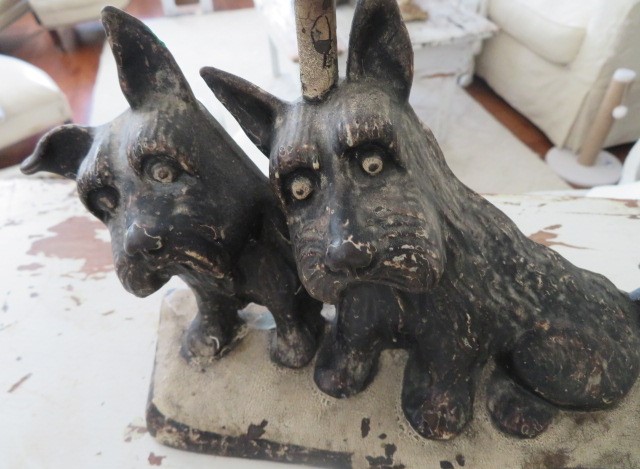 The two dogs are cast iron and adorable. It holds a single regular size light bulb and is in working order. I advise having all vintage lighting checked out. It has a short cord, as it was used in a kitchen for many years. There is some paint loss, minor dirt, minor stains, discoloration and wear.