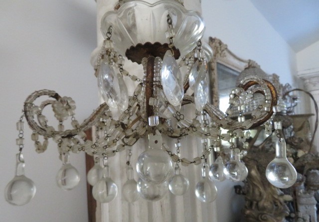This is a very hard to find small single light wall sconce of good quality. It is the very desirable macaroni beaded on the arms sconce. It has the metal frame and glass bobeche. There are NINE rows of macaroni beaded swags. It is ready to hard wire to your existing wall wires. It is in working order. I advise having all vintage lighting checked out. There is some minor dirt, discoloration and a little rust , some stains and dirt to the candle cover sleeve and wear.