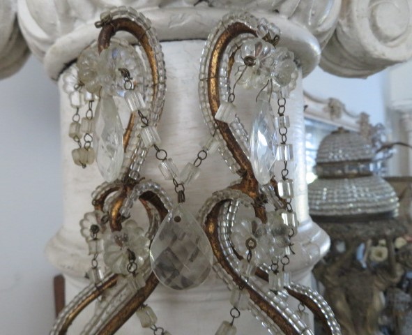 THIS IS AN EXQUISITE OLD VINTAGE MACARONI BEADED ON THE ARMS WALL SCONCE OR WALL LAMP WITH A SINGLE LIGHT THAT HAS 9 ROWS OF BEADED SWAGS AND IS LOADED WITH CRYSTALS.