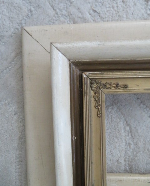 THIS IS A COLLECTION OF THREE OLD ANTIQUE VINTAGE WOOD PICTURE FRAMES WITH THE OLD CREAMY WHITE AND GOLD PAINT AND NICE TIME WORN PATINAS.