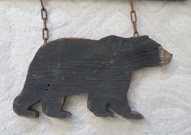What a unique folk art sign! The bear is so cute, and has a metal bracket at the back on one of his legs as a repair. The top has the green painted words that are a little hard to read. There is the rusty chain that connects the two pieces and two rusty metal hangers at the top. There are old cracks, chipped and worn wood, paint loss, chippy paint and wear.