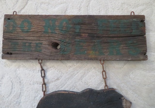 THIS IS A WOOD OLD VINTAGE HANGING SIGN, WITH A CUT OUT BEAR AT THE BOTTOM, AND A CHAIN THAT HOLDS THE TOP PIECE THAT SAYS DO NOT FEED THE BEARS.