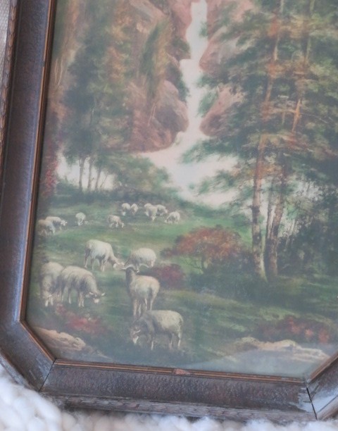 The print is the best! It shows a flock or herd of lots of white sheep in the pasture. The print is covered with glass. The wood has paint loss, chippy paint, discoloration and wear.