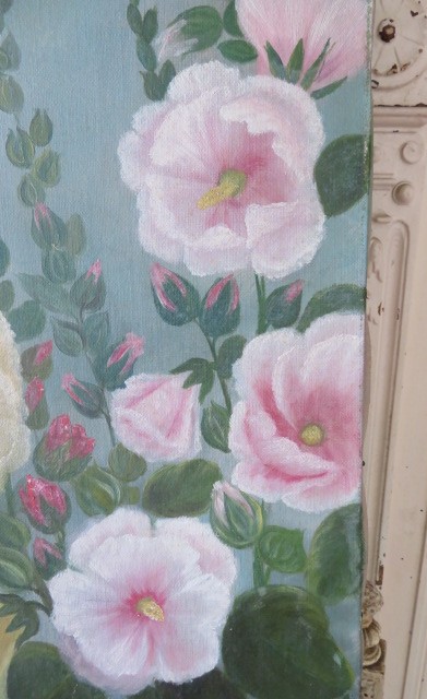 THIS IS A DROP DEAD GORGEOUS OLD VINTAGE FLORAL OIL PAINTING OF HOLLYHOCKS THAT IS PAINTED ON CANVAS THAT IS NAILED TO A WOOD STRETCHER FRAME WITH THE MOST BEAUTIFUL COLORS.