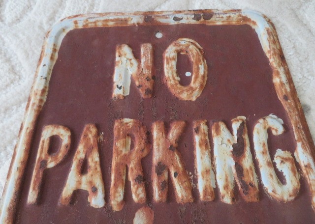 THIS IS AN OLD VINTAGE METAL SIGN WITH RAISED LETTERS THAT SAYS, NO PARKING IN DRIVEWAY THAT IS RUSTY AND WHITE WITH AN AWESOME PATINA.