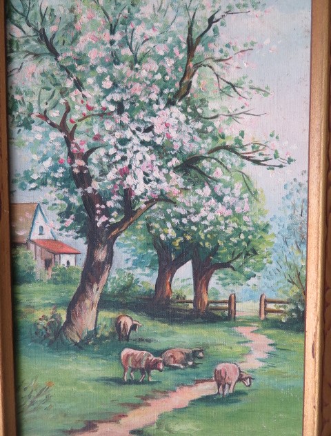THIS IS AN OLD VINTAGE PASTORAL OIL PAINTING OF WHITE SHEEP, FLOWERING TREES, AND A FARMHOUSE IN A PEACEFUL COUNTRY SCENE THAT IS FRAMED IN THE ORIGINAL FRAME.