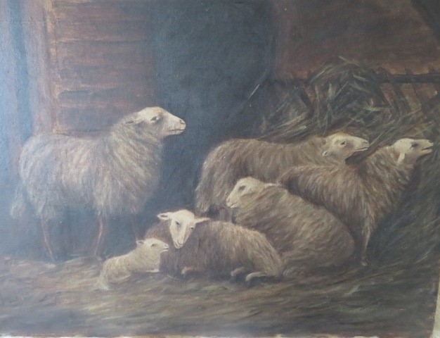 This is drop dead gorgeous and is an older painting of good quality that is well painting. There are 6 white sheep, including the little baby lamb that are in the bard. The colors are the best. There are no signatures or dates. There is minor paint loss, stains, and minor wear.